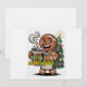 A joyful, cartoon-style Gingerbread Man, depicted with a wide, enthusiastic smile and rosy cheeks. He's wearing a simple white apron and heartily holding up a clear mug filled with dark, steaming coffee, with a prominent plume of steam curling upwards. The text "Spicy and Caffeinated" is creatively integrated onto the coffee mug in a bold, vibrant, multi-coloured font, featuring subtle star and flake embellishments. In the background, a minimalist yet festive green Christmas tree is adorned with red and gold baubles, topped with a star, and radiating faint yellow light rays. The overall style is clean, cheerful, and graphically strong, with clear outlines.