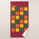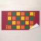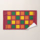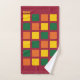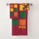 Stylish colourful Monogram Bath Towels with geometric squares in spicy colour palette of yellow, green and orange, against a burgundy background. There is a customisable monogram on the hand and bath towels (linked), which you can replace with your own initials or name. Modern addition to your bathroom decor. Matching items are available. Also comes in pastel colour palette.