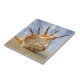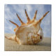 Photograph of a spider conch seashell on a sandy beach against blue sky with wispy clouds.