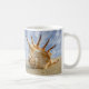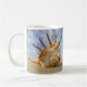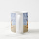 Closeup photograph of a spider conch shell on a sandy beach against blue sky with wispy clouds. Customisable mug size, style and colour.