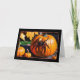 Surrounding the main pumpkin are several smaller pumpkins, which add to the autumnal feel of the card. The background includes bright orange leaves, likely from a nearby tree, with the green grass of a garden or yard visible in the distance. The overall colour scheme is rich with the warm tones of fall, making the card feel both festive and slightly eerie.