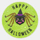 This sticker features a cute spider sitting on her web in her witch costume, complete with striped stockings, witch's shoes and hat. Sticker text is "Happy Halloween!" Art by Anne Coffey.