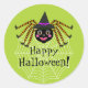 From her orange and black striped stockings to her witch's hat, this cute spider is all dressed and sitting on her web, ready for a fun Halloween! Green background may be customised to change colour. Original art by Anne Coffey.