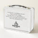 This is a standard metal lunchbox that appears to work just fine. We designed this box ourselves with an uploaded photo and custom text on the front and back. It looks absolutely beautiful except the front of the lunchbox is not centered like it shows in the photo. The print borders don't align with the inset flat part of the box where the preview photo online showed it perfectly centered in there. The back looks nice and centered though.