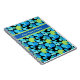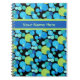 A spiral Notebook or Journal to personalise, with a 'Blue Moons' abstract pattern in bright blues and neon green on a black background; from a handpainted paper collage design by Judy Adamson.
