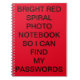 I am very tired of PASSWORDS!!! No matter what I do or where I put them they find a way to disappear! This Spiral Notebook is Bright RED with Black letters on the front to make it easy to find! If you have as much trouble as I do, I hope you will find them quicker with a red cover with black letters. If you would prefer a different colour, let me know.