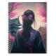Computer-generated design of a Geisha in a cherry blossom forest. A picture of a woman with a beautiful dome and hair blossoms wearing a kimono. Japanese design in AI style. In the background, two Japanese buildings.