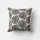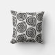 Throw pillow in a block print pattern, based on a spiral seashell, in black on a white background