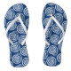 Flip-flops in a block print pattern, based on a spiral seashell, in white on a cobalt blue background