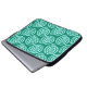 Laptop sleeve in a block print pattern, based on a spiral seashell, in pastel aqua on a turquoise / peacock background