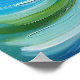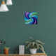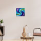 This poster is a vibrant abstract painting that features a colorful swirl of shapes and hues. The composition forms a symmetrical spiral pattern that draws the eye inward. Starting from the outer edge, there's a deep purple that fades into lighter shades of violet as it moves clockwise towards the center. These colors give way to various shades of blue, ranging from turquoise to rich cobalt blues, creating an almost three-dimensional effect. In the heart of this spiral, there's a striking contrast with vibrant greens that blend into light teal, followed by more variations of blue, including sky blue and aqua tones, which then transition back into deeper blues towards the center. The green and blue hues intertwine harmoniously, reminiscent of the blending of watercolor paints or a whirlpool of color.