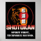 Spirit First Technique Second Shotokan Karate Quote by Gichin Funakoshi with abstract orange tiger motif, and Japanese kanji characters for Shotokan. The short quote is personalizable if you prefer to add your own.