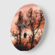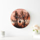 Timber wolf face photo superimposed over a sunset sky with silhouetted trees to create a mystic wolf wall clock
