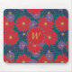 Large scarlet red, medium navy blue, and small royal purple daisy-like flowers are scattered across a rich jungle green background to create a colourful floral pattern that is perfect even for autumn. Customise the monogram on this mousepad with your initial to make it your own.