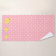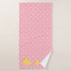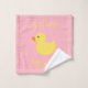 A cute towel set with a pink background and white polka dots, three yellow rubber ducks along the bottom edge, creating a playful design that adds a pop of colour to any bathroom. Make a statement with our personalised hand towel by adding your monogram. The washcloth features a lone rubber duck and the phrase, Splish Splash. It's a delightful reminder to enjoy the simple pleasures of life, making your bathing experience both fun and refreshing.