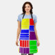 This apron has a Bauhaus design of rectangles divided into ever smaller pieces in red, yellow, blue, green, purple on a field of white.