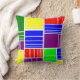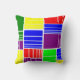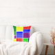 This throw pillow has a Bauhaus design of rectangles divided into ever smaller pieces in red, yellow, blue, green, purple on a field of white.