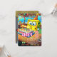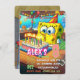 Bold, colorful text elements are arranged throughout the design, highlighting the birthday child’s name, age, date, time, address, and RSVP details. The overall style is whimsical, energetic, and inviting—perfect for a kids’ birthday party invitation, printable card, or digital party announcement.