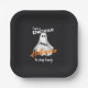 A playful Halloween Paper Plates featuring a cheerful cartoon ghost with bold "BOO!" lettering across its chest. Set against a dramatic black backdrop, the design pops with whimsical typography and festive colours. The top and bottom text create a lively seasonal message, while the family name area is fully customisable—perfect for adding a personal touch to your haunted hello. Ideal for spreading spooky cheer with charm and flair.
