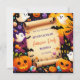 The design features an aged parchment scroll at the centre, providing a blank space for text. Surrounding the scroll are various Halloween-themed icons, including smiling jack-o’-lanterns, ghosts with different expressions, candy corn, Halloween-coloured lollipops, black spiders, and bats. The background is a deep purple with subtle star patterns, creating a playful and spooky atmosphere perfect for a Halloween invitation.