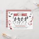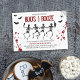 Throwing a halloween party - check out this blood splattered spooky invitation, which features drunk dancing skeletons, a cobweb and spider, red blood splatters and black bats. The title is in distressed script keeping in theme with halloween "boo's and booze" and a modern template which is easily customised.