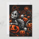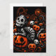 Dive into the eerie charm of Halloween with this striking image featuring a skeletal cat perched atop a pumpkin, surrounded by smaller jack-o’-lanterns and skulls. The black and orange colour palette, accented with white bones, perfectly captures the spooky yet playful essence of October festivities, making it an ideal choice for seasonal decor or themed events.