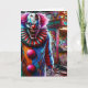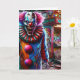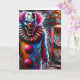 Scary colourful psychedelic comic book style clown at circus or carnival Halloween card. With inside pun and colouring page.