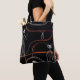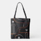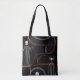This tote bag features a sleek, dark design with a Halloween-inspired art pattern. Set against a black background, the artwork depicts thin, swirling orange and white lines reminiscent of winding paths or vines. Interspersed among the lines are minimalistic, skeletal figures with hollow eyes, giving the bag a spooky, whimsical vibe. The figures resemble playful skeletons or spirits, adding an eerie but light-hearted charm. This bag is perfect for those looking to embrace the spooky season with subtle, stylish flair.
