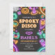 Celebrate Halloween Birthday with this vibrant Spooky Disco Halloween Birthday Invitation! Featuring Halloween elements in eye-catching neon, this design combines the fun of a disco with the thrill of Halloween. Neon bats, ghosts, pumpkins, and webs pop against a dark background, setting the scene for a night of dancing and spooky fun. BRT124