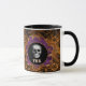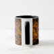 This spooky but elegant Halloween coffee mug design features a scary skull, encircled in black and surrounded with a purple and orange frame, on each side of the mug. Your initials appear below in grunge-inspired typography. Lacy orange and black damask roses, leaves, and lacey frills adorn the background. The look is fancy but definitely strikes a Goth or Haloween vibe. This mug is shown in an option for a black handle and interior, but other colours like orange are available, as well as other drinkware options.