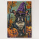 Embrace the Halloween spirit with this enchanting design featuring a cute dog in a witch hat surrounded by carved pumpkins. Perfect for adding a touch of spooky charm to your festive celebrations.