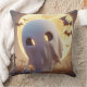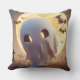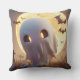 A charming illustration of a ghost amid a graveyard at night, surrounded by flying bats and illuminated by the glowing light of a full moon, evoking a spooky Halloween atmosphere.