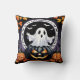 A playful ghost emerges from a pumpkin amidst a festive Halloween backdrop, complete with bats and vibrant autumn leaves.