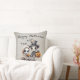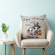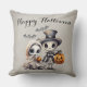 This Halloween themed throw pillow features a spooky and cute, gothic cartoon style illustration. An image of a boy skeleton wearing a top hat and suit jacket, and a little ghost girl porcelain doll are pictured at the bottom. Two cute bats fly above their heads as they carry their jack o' lanterns through the night. A "Happy Halloween" greeting is printed across the top of the pillow in an elegant script font. The background features a shadow pattern.