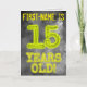 The front of this spooky looking, editable birthday card design features the message "15 YEARS OLD!" with characters and digits having an eerie glowing aura inspired appearance, on a mysterious grey cloudy mist-inspired background pattern. The front also features an editable recipient name. The inside features a birthday greeting message that can be personalised. A personalised birthday greeting card like this might be a special way to send birthday wishes to somebody who is celebrating their fifteenth birthday. [~Z0000365]