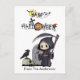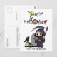 Send spooky, whimsical Halloween greetings with this cute watercolor Halloween postcard! The design features a playful Grim Reaper walking through a creepy cemetery, his sickle in hand, while a black crow perches atop a skull. “Happy Halloween” pops in festive style with a Jack-o-Lantern pumpkin, a witch hat, spiderwebs, a bright yellow full moon with a fluttering bat, and a scary ghost, the perfect mix of fun and spine-chilling charm.