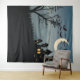 Halloween party backdrop or background for party decor or photo booth with haunted house, mountains, moon, bats, bare tree. Fun party photography prop for selfies or portraits.