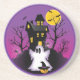 Spooky Halloween ghost in front of his haunted house with spider webs, pumpkin and bats flying in moonlit sky.