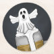 Spooky Halloween ghost on top of a filled beer mug with foam on top.