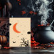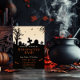 Prepare for a hauntingly good time with this spooky Halloween design. Set against a shadowy backdrop, the silhouette of a graveyard with creepy trees and tombstones creates a chilling atmosphere. Glowing eyes peek from the bottom, adding an extra touch of eerie charm. Perfect for setting the scene for your Halloween bash!