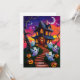 Explore this enchanting Halloween illustration featuring a spooky haunted house under a crescent moon, surrounded by pumpkins and a mysterious path.