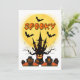 This invitation display the words "Spooky" in a unique print font with orange letters plus creepy treehouse, jack o laterns, bats and graveyard with other spooky theme decals in this Halloween theme and style. Printed on a classic, all around paper 17.5 pt thickness with an uncoated matte finish with an eggshell texture made and printed in the USA with "Trick Or Treat" printed on the back.