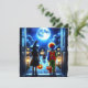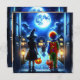 Scary Halloween Party invitations. Two kids in a clown costume and witch costume looking out their front door at a scary monster looking at them. Enter if you dare!
