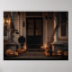 Get into the Halloween spirit with this eerie porch scene featuring glowing jack-o'-lanterns, candlelight, and spooky cobwebs draped over the entrance. The dark and mysterious ambiance is perfect for setting a chilling tone, with subtle decorations like adding to the haunted vibe.