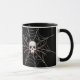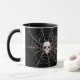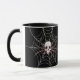 Unique creepy Halloween theme skull spider on a spiderweb with black a background coffee mug. This mug would be a perfect gift for anyone or a great addition for a Halloween themed party celebration. Comes in an assortment of colours for the inside and handle of the mug.