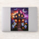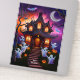 A captivating Halloween night scene featuring a spooky haunted house with glowing jack-o'-lanterns, eerie purple skies, and bats.