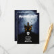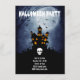 Two-sided enclosure care / invitation with a black haunted house, a skull, and ghost on a spooky blue moonlit evening. White "Halloween Party" text is on the front. Customise and personalise the party details on the front. The back shows the ghost and bats. This card is spooky, ethereal, creepy, and cool. Pair it with its matching blue envelope.