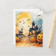 Halloween postcard featuring a watercolor illustration of a haunted church, bats and jack o’lanterns.