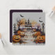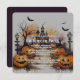 Halloween party invitation featuring a watercolor illustration of spooky jack o’lanterns, bats and a haunted mansion.