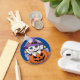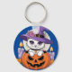 A white cat wearing a witch hat sits in a Halloween pumpkin surrounded by candles.